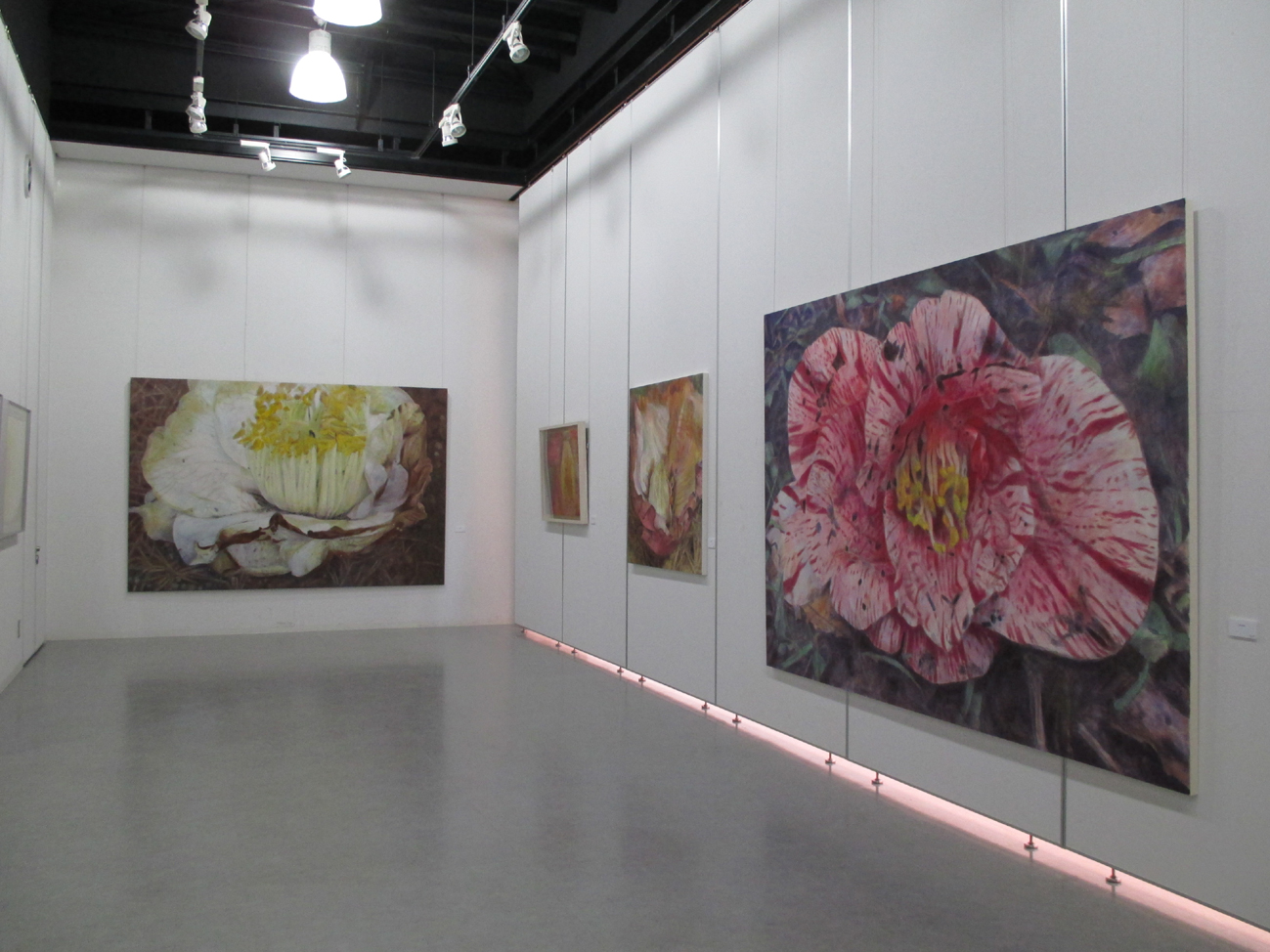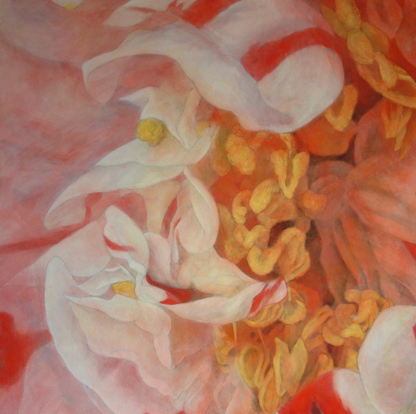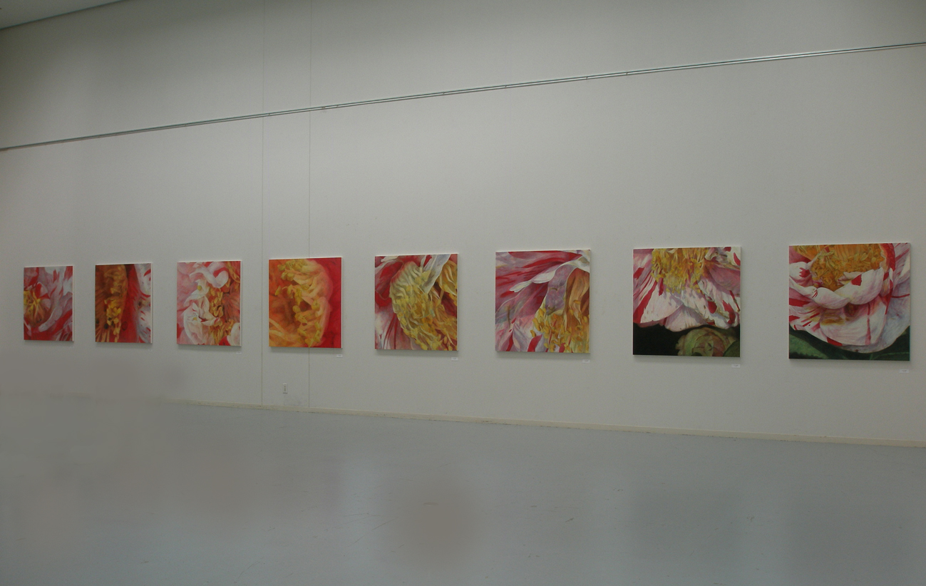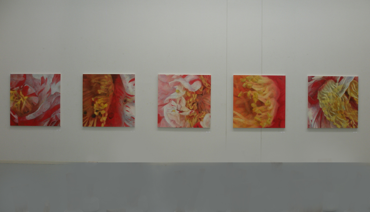 I have started this series of work called “A fragment of memory” since 2005. It is because the information of life is memorized in DNA. So this is symbolic part of the memory. The reason why I chose camellia flowers for my paintings was that the part of pistils and stamens were very big and outstanding on these flowers. So it is good to show my intension. It is obvious on my paintings. I intended to cut out the images as a fragment, so that this enlarged size was suitable for me. We can imagine the whole images as the big size from the fragments of images.