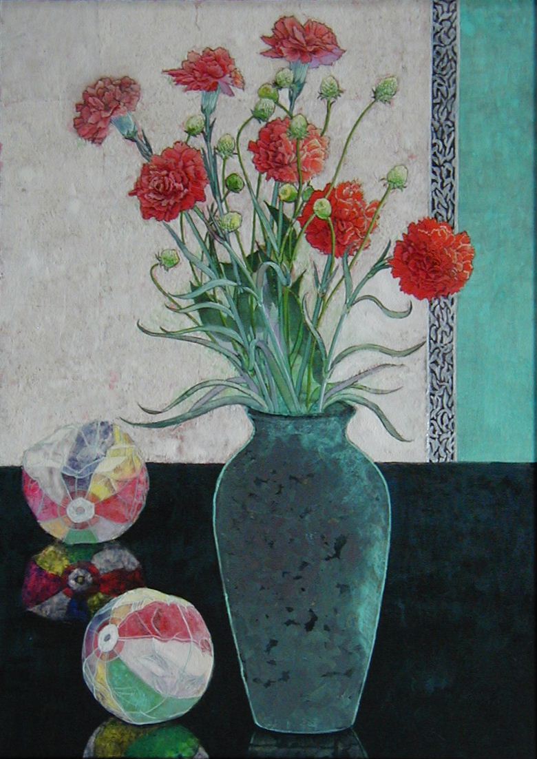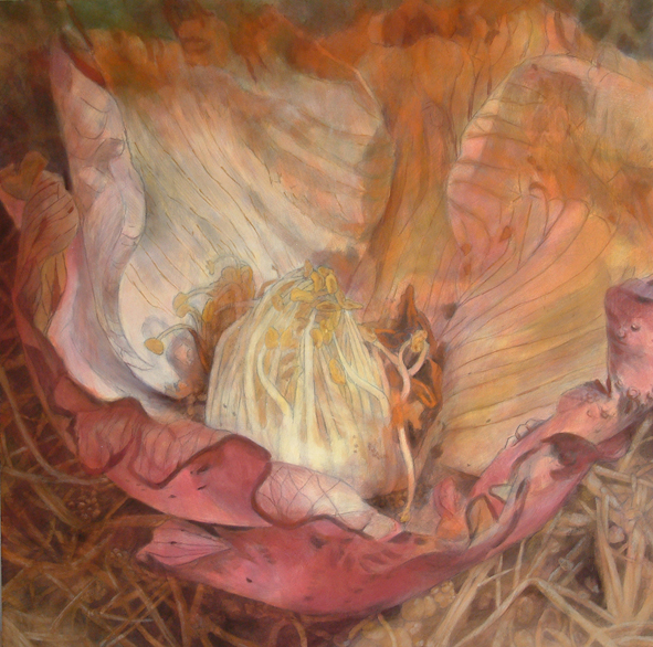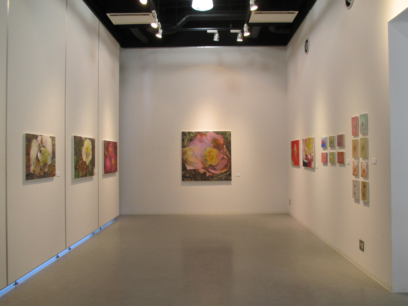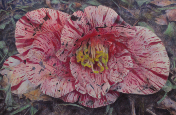 I have started this series of work called “A fragment of memory” since 2005. It is because the information of life is memorized in DNA. So this is symbolic part of the memory. The reason why I chose camellia flowers for my paintings was that the part of pistils and stamens were very big and outstanding on these flowers. So it is good to show my intension. It is obvious on my paintings. I intended to cut out the images as a fragment, so that this enlarged size was suitable for me. We can imagine the whole images as the big size from the fragments of images.