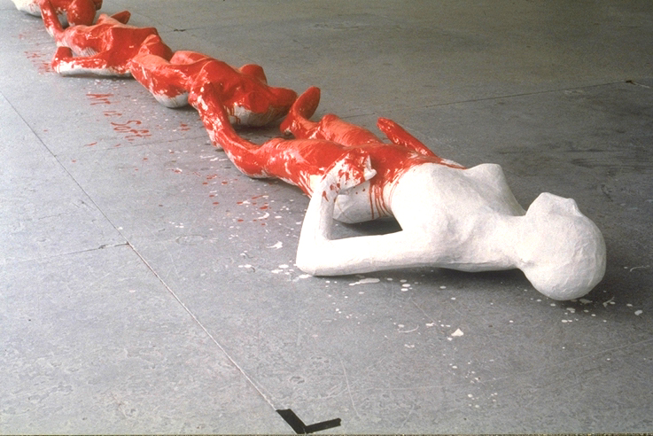 untitled (from "my obsessions")/screen print on fabric, wood panels, mannequins, paint / 1500 x 6600 mm / 1996